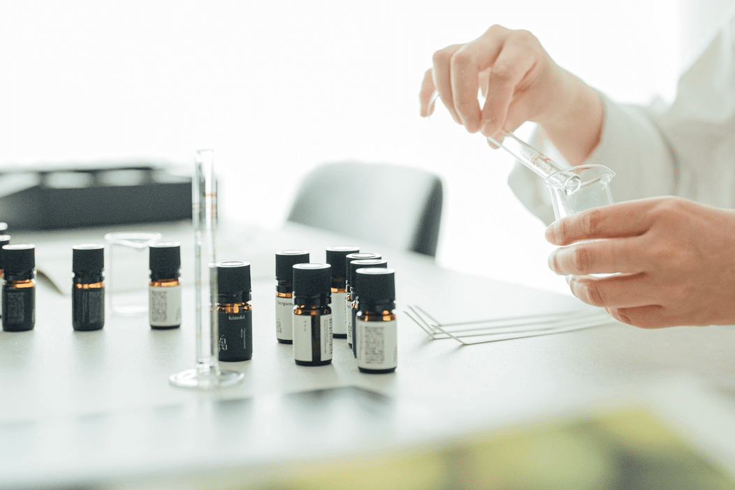 - 学ぶ→できる→仕事にする、の一直線のカリキュラム。『講座受講』と『アロマ調香Lab』が循環し、学びが仕事や暮らしに繋がります。さらに、たくさん嗅ぎ、手を動かす実践重視で、調香に不安な方でも上達できる独自の教え方を徹底しています。